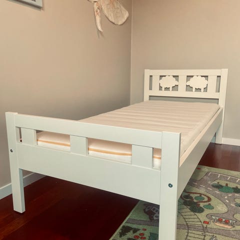 2 stk IKEA juniorseng i hvit utførelse. Sengen har sengehest på én side og plass under sengen som kan brukes til oppbevaring. Passer til barn som har vokst ut av sprinkelseng og over i juniorseng. Noe bruksslitasje kan forekomme, se bilder for detaljer på overflate og kanter.
