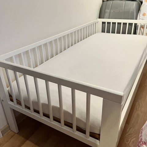 Kan og få med madrassbeskytter og 2 hvite strekklaken.