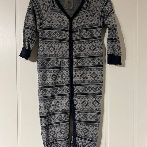 Hjemmestrikket ulldress for barn i størrelse 92-98 ca 2-3 år ubrukt. unisex. Dressen er laget i ull og har flerfarget stripemønster i mørke og lyse toner. Den har lange ermer og ben, samt knappelukking foran hele veien ned for enkel av- og påkledning. Passer godt som varm og myk heldress til hverdagsbruk eller som mellomlag på kjølige dager.