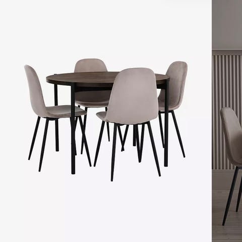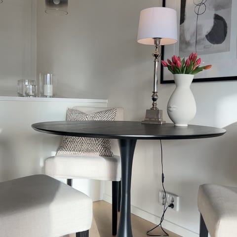 Rundt spisebord med svart bordplate i askefiner og matchende understell i stål. Ø100 x H75 cm.