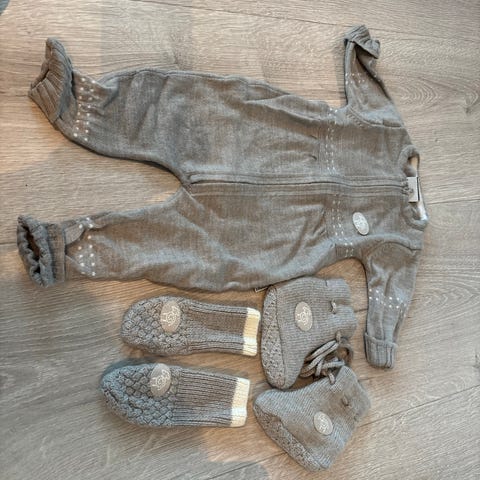 Super fint sett som vi dessverre ser helt nytt ut da vi kun rakk å bruke det en gang. Føler med lue i nyfødt størrelse og tøfler