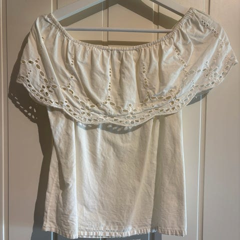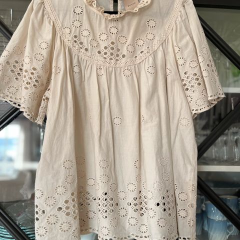 Odd Molly topp i bomull for dame i fargen beige, størrelse 4/XL passer mer som L. Toppen har korte ermer, knyting i halsen og dekorative blonde- og broderidetaljer langs utringning, ermer og nederkant. Laget i lett bomullsstoff som passer godt til bruk over bukser, skjørt eller shorts.