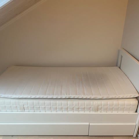 Sengen selges i utgangspunktet uten madrass, da madrassen har noen flekker. Madrassen (IKEA VESTERÖY 90x200) kan eventuelt medfølge etter avtale dersom kjøper ønsker det.