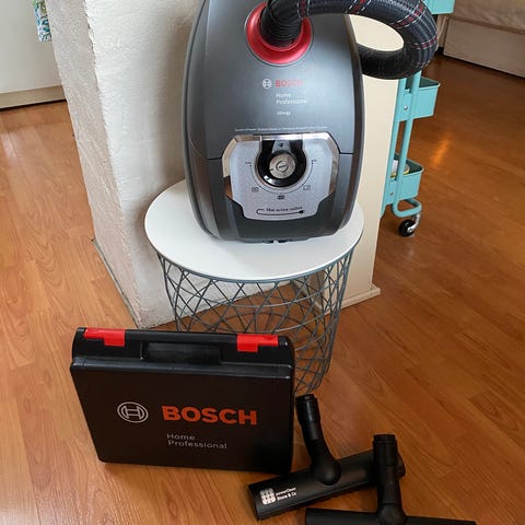 Støvsugeren er en tradisjonell gulvmodell med støvpose. Den har regulerbar effekt via dreiehjul på fronten og tilkobling for teleskoprør og slange på toppen. På bildene følger det med teleskoprør, slange, munnstykke og 4 stk støvsugerposer som passer til Bosch/Siemens.