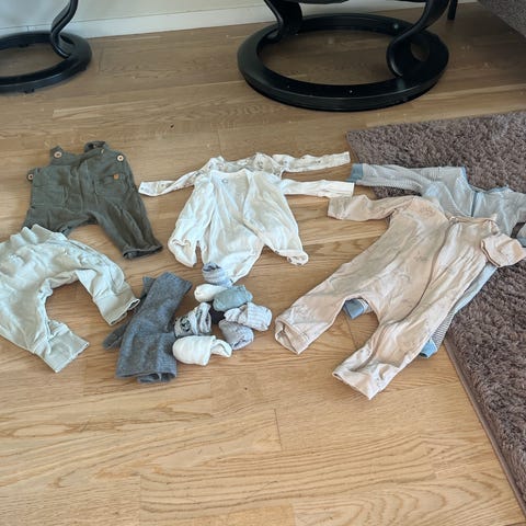 babyklær i størrelse 62 i flerfargede toner. Pakken inneholder ulike plagg som bukser, genser og lue, med mønstre som striper, blomster og kamuflasje i dempede farger. Klærne passer til baby og er egnet til hverdagsbruk. Materialet fremstår som mykt og behagelig kan kombineres på flere måter for variert bruk.