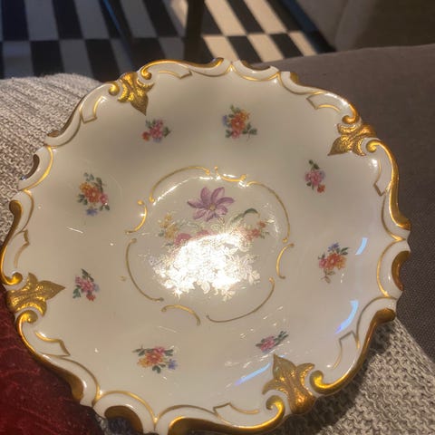 Porsgrund Flora Alpina kakefat på stett i porselen. Fatet er hvitt med rosa blomsterdekor, grønne blader og gullkant rundt kanten. Diameteren er ca. 20cm. Egnet til servering av kaker, småkaker eller dessert. Designet har svakt buet og inndelt kant som gir en dekorativ form. Undersiden er merket med Porsgrund og Flora Alpina. Det kan sends