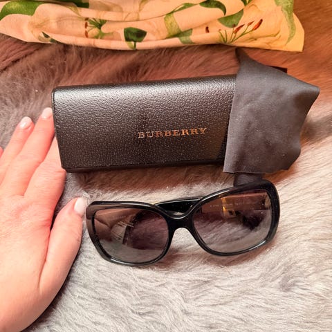 Burberry solbriller for dame med svart front og Burberry-rutete stenger. Rektangulær innfatning med helramme rundt glassene. Gradert, mørkt farget glass som gir solbeskyttelse for øynene. Brillene er kun brukt et par ganger og er i helt fin stand. Har både boks, brilleboks og kvittering som bekrefter at solbrillene er ekte.