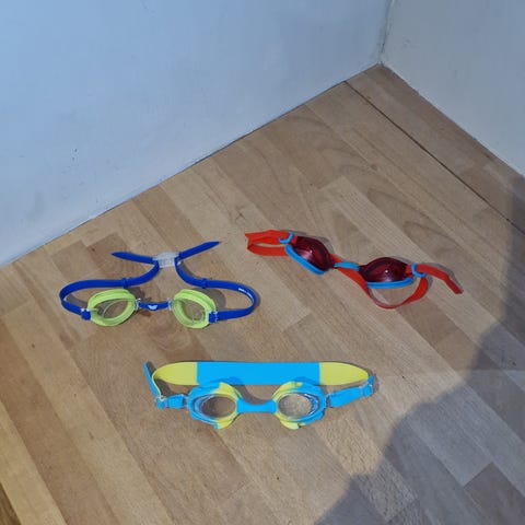 Svømmebriller for barn i blå farge med hvalmotiv rundt glassene. Justerbar stropp for tilpasning til barnets hode. Egnet til bruk i svømmehall eller basseng for å beskytte øynene mot vann.