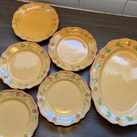 Egersund Fayancefabrikk, produsert i perioden 1956–1963. Fatet og asjettene, har en nydelig dyp gulfarge,