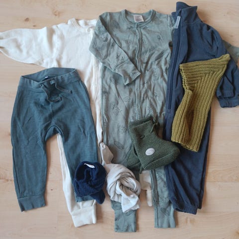 Selger en klespakke med ullklær i størrelse 80.
