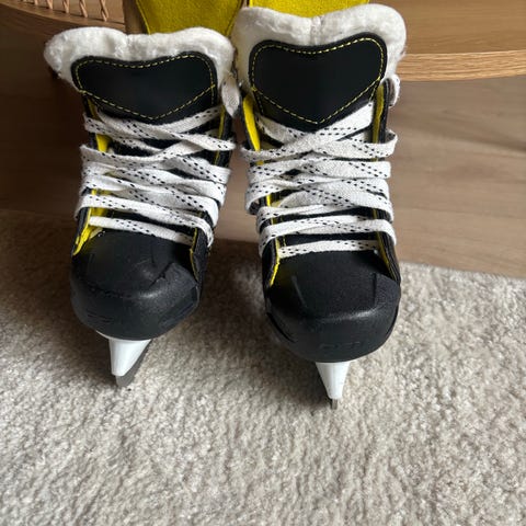 Skøytene festes utenpå egne vintersko. Justerbare mellom ca str 24-33. Kjøpt på Sprell. Mangler ekstra polstring på stroppene.