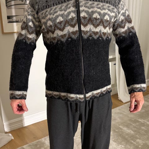 Kjempefin strikkejakke,antar i ull. Fine farger og kule knapper. Ca str XL.