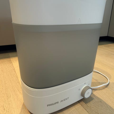 Philips Avent flaskesterilisator elektrisk i hvit farge. Enheten er beregnet for sterilisering av tåteflasker og tilbehør ved hjelp av damp. Den har beholder med lokk og kontrollbryter på fremsiden. Passer til bruk på kjøkkenbenk med tilkobling til vanlig stikkontakt. Egnet for foreldre som ønsker en praktisk løsning for rengjøring og sterilisering av babyutstyr.