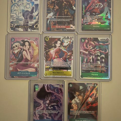 Jeg selger en samling på 433 One Piece-kort, hvor alle er av typen SR (Super Rare). Samlingen består av både engelske og japanske kort. Selges alt samlet inkludert koffert for 15 kr per kort.