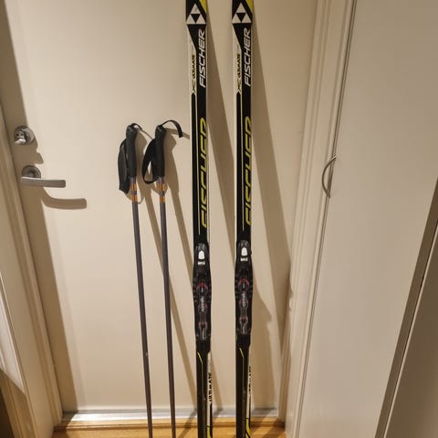 Fischer langrennski med Rottefella NNN-bindinger og tilhørende langrennsstaver.
