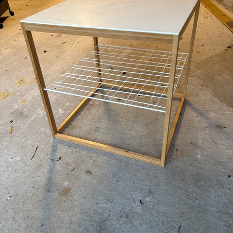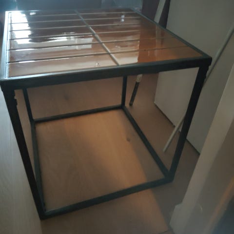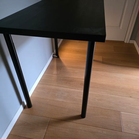 Fint lite bord med LED lys og smart kontroll som kan styres med Google eller mobil telefon. Bordet er fra IKEA tror eg, men aner ikke fra når. Litt slitt her og der, men veldig stabilt og stødig.