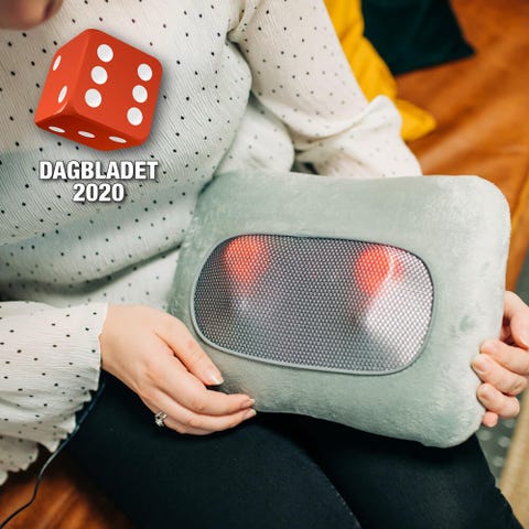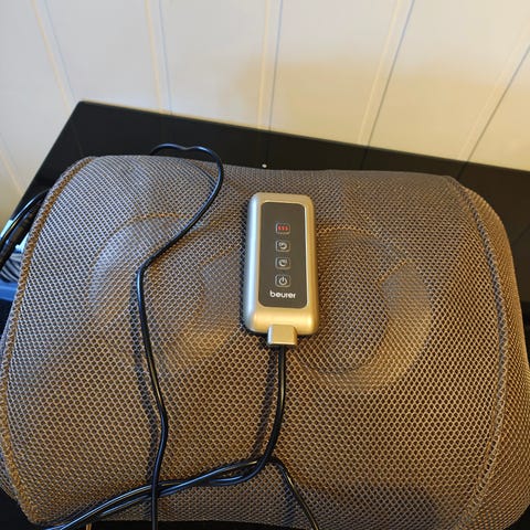 Beurer massasjepute for nakke og skuldre i grå og burgunder tekstil. Elektrisk modell med ledning og medfølgende strømadapter. Integrert betjeningspanel på siden med flere funksjonsknapper for justering av massasjeprogram. Utformet som en krage som legges rundt nakke og skuldre for punktvis massasje og avlastning av muskulatur i nakke- og skulderparti. Passer til bruk hjemme, for eksempel i stol eller sofa.