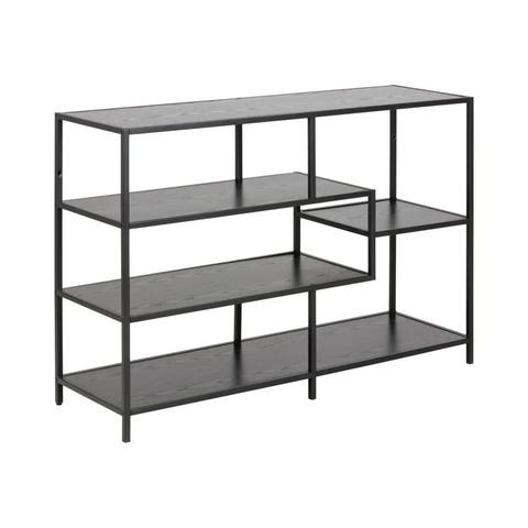 MALSJÖ TV-benk fra IKEA. Den er svartbeiset og har skyvedører i glass.