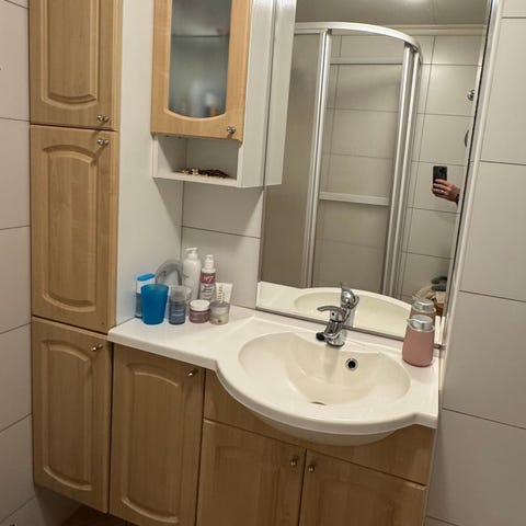Vask og speilskap til bad med speilfront og hvit toppplate. Skapet er egnet for oppbevaring av baderomsartikler. Passer til montering på bad eller vaskerom der det er behov for ekstra oppbevaringsplass og speil i ett møbel. Målene til skapet kan sees på bildene. Vasken har noen riper/slitemerker i seg og spotten i speilskapet er defekt, ellers i god stand. Platen på venstreside har skjært ut et spor for føring av vann og avløp.