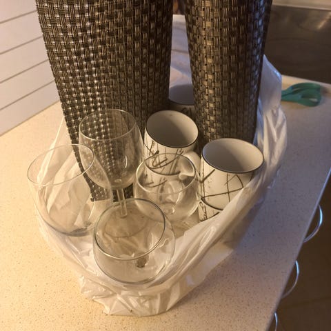 Fire esker med ulike glass, kopper, tallerken. Mye vinglass og drinkglass. Usikker på alt innhold. Trolig IKEA.