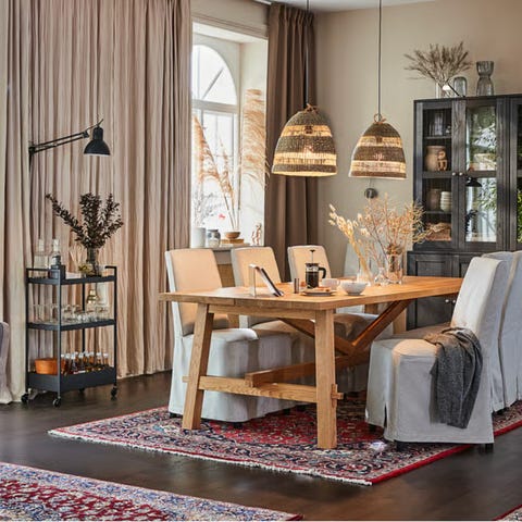 Maddock er et praktisk spisebord som kan forlenges med opptil 2 stk ileggsplater. Bordplaten er av FSC®-sertifisert semimassiv brunoljet eik. Det betyr at øverste del av bordplaten består av 3 mm massiv eikefiner, noe som gjør bordet meget holdbart. Bordbena, som er av svart pulverlakkert metall, er plassert slik at man får maksimal utnyttelse med stoler rundt bordet. Dersom du trenger et større spisebord, kan du forlenge bordet til 185 cm med 1 stk ileggsplate, eller til 235 cm med 2 stk ileggsplater