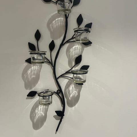 Vegglysestaker med glassholdere. Sett med to veggmonterte lysestaker i metall med buet design og tilhørende glasskopper til telys eller små stearinlys.