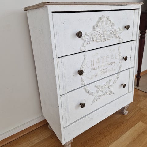 Kjempefin og romslig kommode fra Home & Cottage. En hylleplate som deler kommoden i to innvendig. Dørene kan åpnes helt opp.