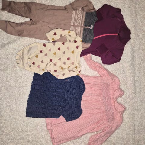 - 1 gammelrosa mønstret, også nokså tjukk fra Hust&Claire. Knapper langs hele siden av bodyen.