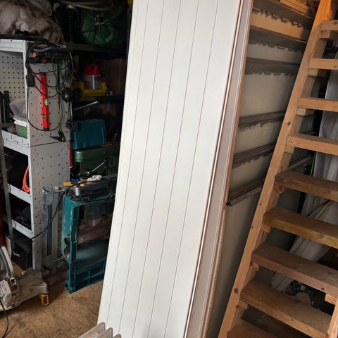 Panelbord i tre, hvitmalte. Revet og ødelagt i not og fjær.