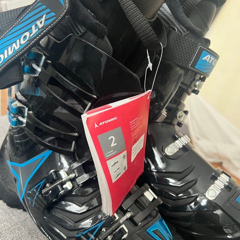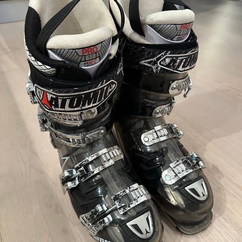 Atomic B Tech alpinstøvler i svart plastskall med fire justerbare spenner og powerstrap øverst. Støvlene har sålelengde 324 mm (støvelskallstørrelse oppgitt på sålen). Innermodellen er polstret for komfort og støtte. Str 43/44. Jeg bruker 44, men de blir litt smale til min fot.