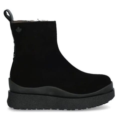 Svarte ullforede platåboots i lakkskinn fra Canada Snow. En klassisk, sportig chelseaboot med en innebygd kilehæl for god komfort.