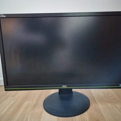 AOC G2590FX skjerm med 24 tommer skjermstørrelse. Skjermen har svart design med rød detalj på fronten og rund fot. Egnet som dataskjerm til generell bruk, arbeid eller gaming, avhengig av tilkoblet utstyr og brukerens behov. Skjermen kobles til PC eller andre enheter via tilgjengelige porter på baksiden (se bilder for detaljer).
