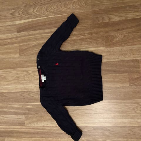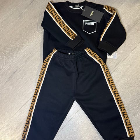 Christian Dior joggedress for gutt i størrelse 86. Sett med grå genser og matchende joggebukse. Genseren har rund hals, lange ermer og dekorativ Christian Dior-logo over brystet. Joggebuksen har elastisk linning og allover-mønster med logo, samt ribbekanter nederst på bena. Mykt og behagelig materiale egnet til hverdagsbruk for små barn.