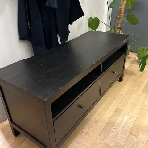 Kommoden er i fin stand. Det mangler bakplate, men dette har ingen praktisk betydning for bruk. Har hvertfall ikke vært noe problem for meg til oppbevaring av klær/kombinert tv-benk