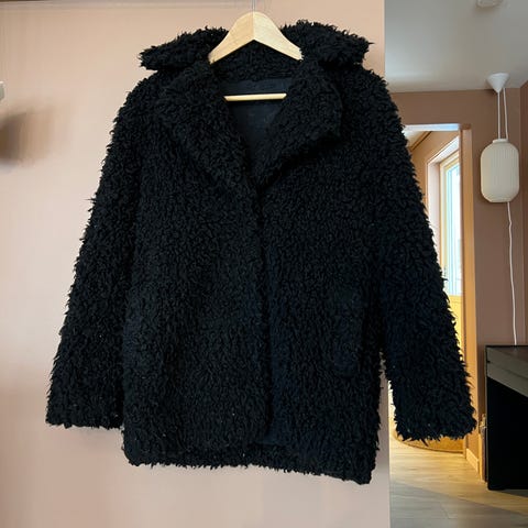 Vero Moda Victo Jacket, halv lang jakke for dame i størrelse M. Kåpen er svart og laget med ull i ytterstoffet (ullblanding). Modellen har høy krage, knappelukking i front og lommer foran. Jakken har god innsving i livet og smal passform.
