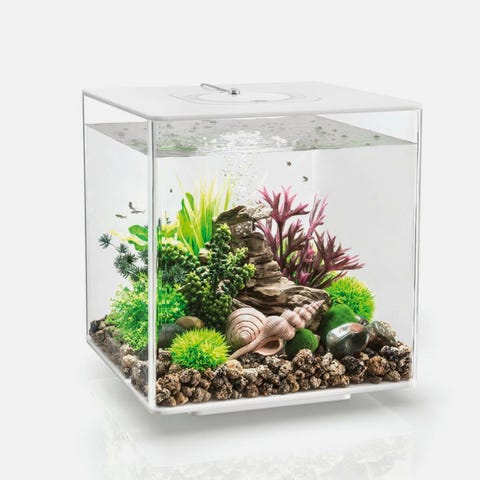 biOrb akvarium (15l) med integrert pumpe og dekor i hvit plast. Akvariet har innebygd filterløsning i bunnen med sirkulasjonsrør opp i tanken. Det følger med luftpumpe med slanger og strømforsyning, samt dekorasjoner som kunstig korall, steiner og bakkeelementer.