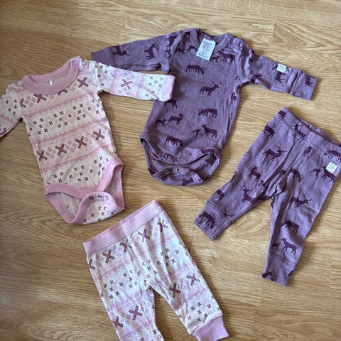 3 sett med body og bukse i merinoull fra reflex. I god stand uten hull eller flekker. Ser brunt ut på bilde men er dus mørke lilla.