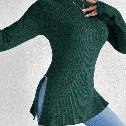 ribbestrikket genser for dame i størrelse S. Genseren har tettsittende passform med lange ermer. Den er flerfarget med lys base og mørke kontrastdetaljer rundt halsen på den ene siden, samt ensfarget lys ribbestrikk på den andre. Materialet fremstår som mykt og elastisk strikket stoff. Passer til hverdagsbruk og kan kombineres med både bukser og skjørt.