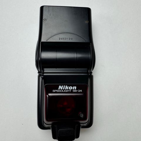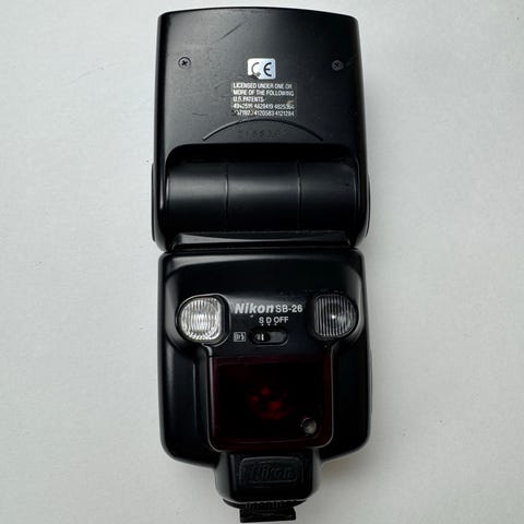 Nikon Speedlight SB-26 blits i svart. Ekstern kamerablits med zoomfunksjon og innebygd display på baksiden for innstillinger. Passer til Nikon-kameraer med kompatibelt blitssko-feste. Egnet til fotografering innendørs og utendørs der det er behov for ekstra lyskontroll og mer fleksibel belysning enn innebygd kamerablits.