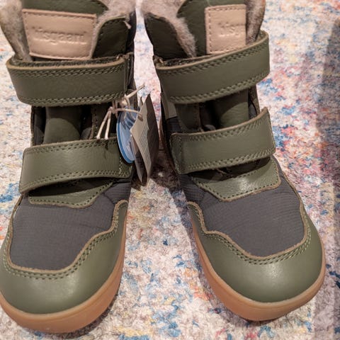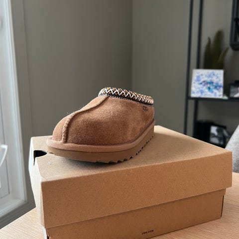 UGG tøfler for barn i størrelse 31. Modellen er åpen hæl-tøffel med brun utside og hvitt, mykt fôr. Unisex-modell som passer både gutter og jenter. Egnet som innesko eller tøfler hjemme. Såle med lett profil for bruk innendørs.