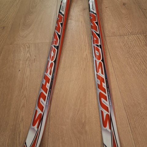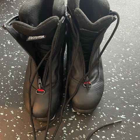 Alpina langrennsstøvler i rødt og hvitt. Støvlene har glidelås i front og borrelåsreim øverst for stramming rundt ankelen. Sålen har grovt mønster for godt feste ved gange uten ski. Egnet til klassisk langrenn, med overdel i syntetisk materiale som dekker og beskytter lissene.