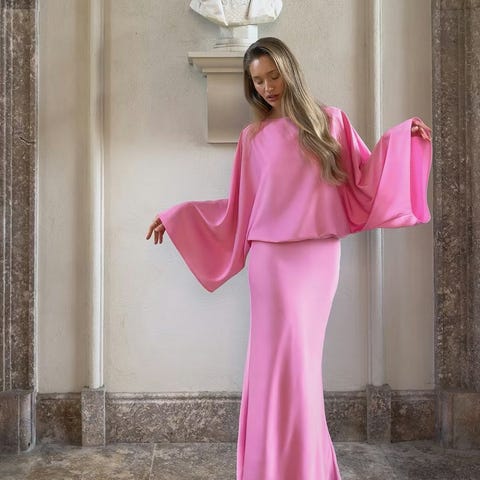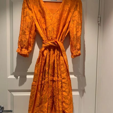 Gina Tricot festkjole for dame i størrelse M. Kjolen er rosa og laget av polyester. Modellen har knelang lengde og er egnet til fest og andre anledninger der man ønsker en pen kjole. Stoffet har en blank overflate med en knyting i midjen som gir den en elegant vri. Kjolen er krøllete fordi den har vært oppbevart i boden sammen med andre klær, og trenger derfor å strykes.