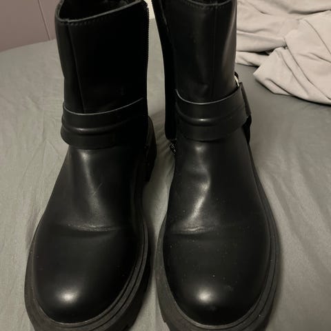 Lekre primark hæler i form av ankelhøye støvletter i størrelse 39. Skoene er i svart, blankt lakkmateriale med grov blokkhæl. De har glidelås på siden med rund metallring som detalj.
