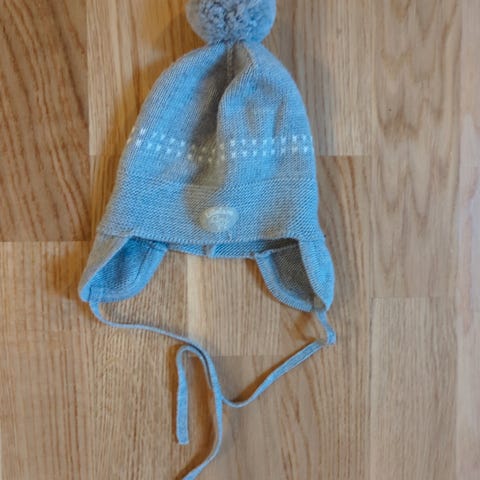 Lillelam lue pent brukt. Lua har øreklaffer og knytebånd under haken for å sitte godt på hodet. Strikket i myk merinoull som gir god varme.