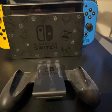 Nintendo Switch spillkonsoll. Håndholdt og stasjonær konsoll som kan brukes både på TV og i håndholdt modus. Joy-Con-kontrollere kan brukes festet til konsollen eller trådløst. Egnet for ulike typer spill og flerspillerbruk lokalt eller online, avhengig av spill og tilbehør.