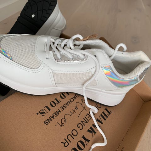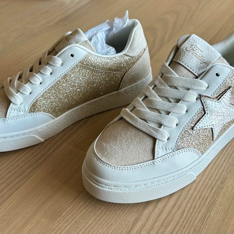 Zadig & Voltaire sneakers i størrelse 38. Modellen er i hvitt med detaljer i gull, perfekt til våren. Klassisk joggesko-modell med snøring foran.