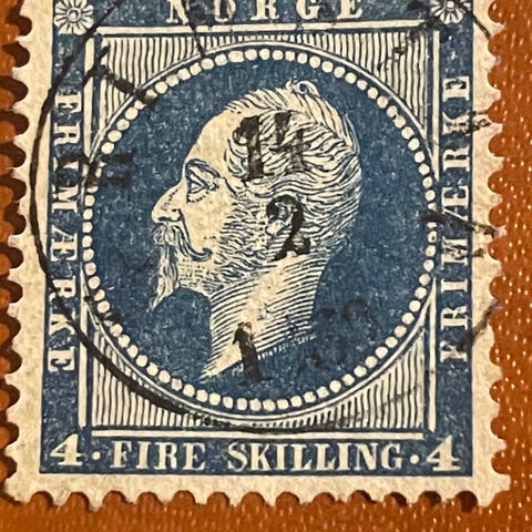 Norge frimerke 4 skilling i blå farge med løve-motiv og riksvåpen. Klassisk norsk skilling-utgave, stemplet, med tagger rundt. Egner seg til samling av eldre norske frimerker og historisk postmateriale.