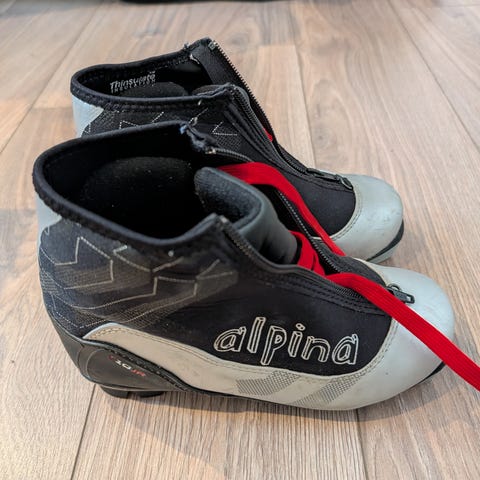 Alpina langrennsstøvler i størrelse 32. Støvlene er svarte med lisser og glidelåslukking over vristen. Sålen er tilpasset moderne langrennsbindinger (se bilder for detalj på såle og bindingssystem). Overdelen er i syntetisk materiale med tekstilfôr på innsiden. Egnet til barn som trenger stabile og varme sko til langrenn og skiturer.