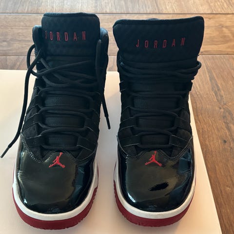 Nike Jordan joggesko i hvit farge med røde og svarte detaljer. Skoene har snøring foran og gummisåle med godt mønster for grep. Tallene 23 og Jordan-logo er plassert på hæl og yttersåle.