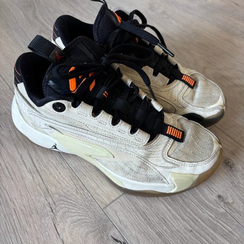 Nike Jordan joggesko i hvit farge med røde og svarte detaljer. Skoene har snøring foran og gummisåle med godt mønster for grep. Tallene 23 og Jordan-logo er plassert på hæl og yttersåle. De er ikke brukt så mye pga vokste raskt ut av dem, de ser bra ut syntes jeg!